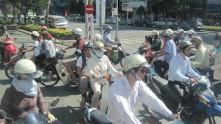 “In Vietnam we have 85 million people and 70 million motorbikes: - motorbikes. The adults have to wear crash-helmets: - crash-helmets, but not the children: - children.”